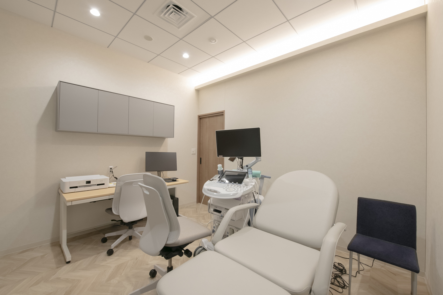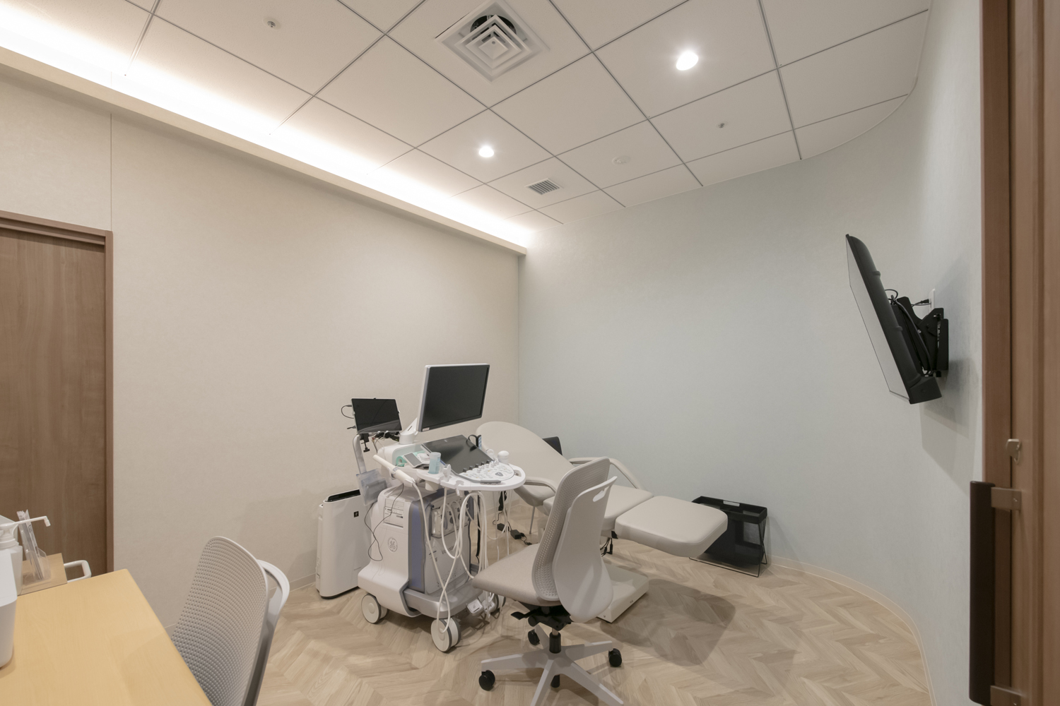 妊婦さんに負担の少ないリクライニングを使用するとともに、患者様も専用のモニターを見ることができるようになっており、医師と一緒に画像を見ながらの説明が可能です。