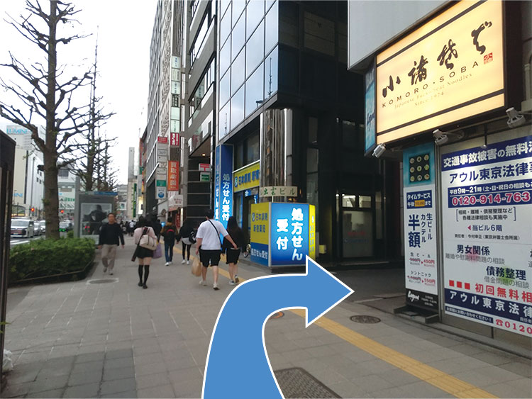 まっすぐ進むと日本調剤新宿薬局が見えますので、手前を右折してください。