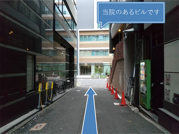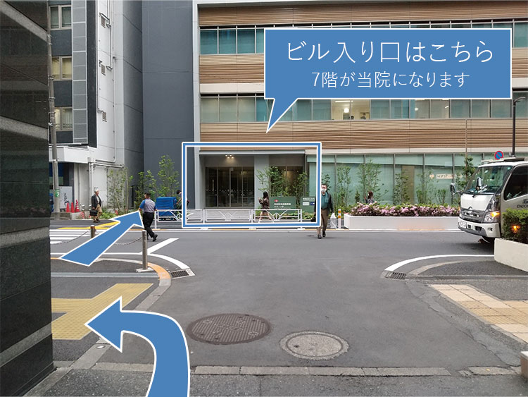 正面奥に見えるビルが当院のあるビルです。